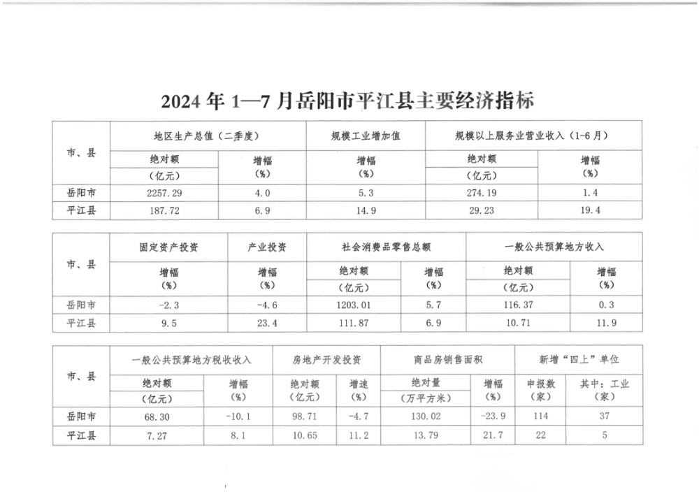 2024年1—7月岳阳市平江县主要经济指标