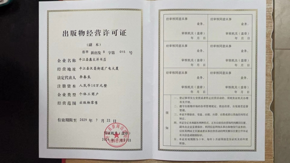 平江县鑫太洋书店出版物经营许可证