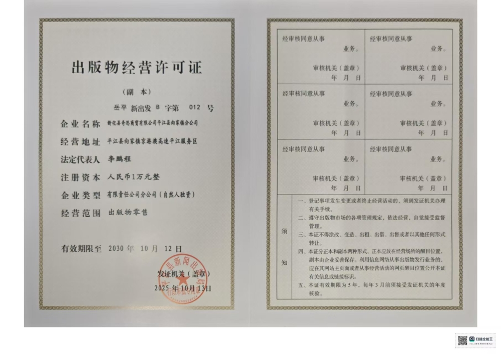 新化县奇思商贸有限公司平江县向家镇分公司申请出版物经营许可证