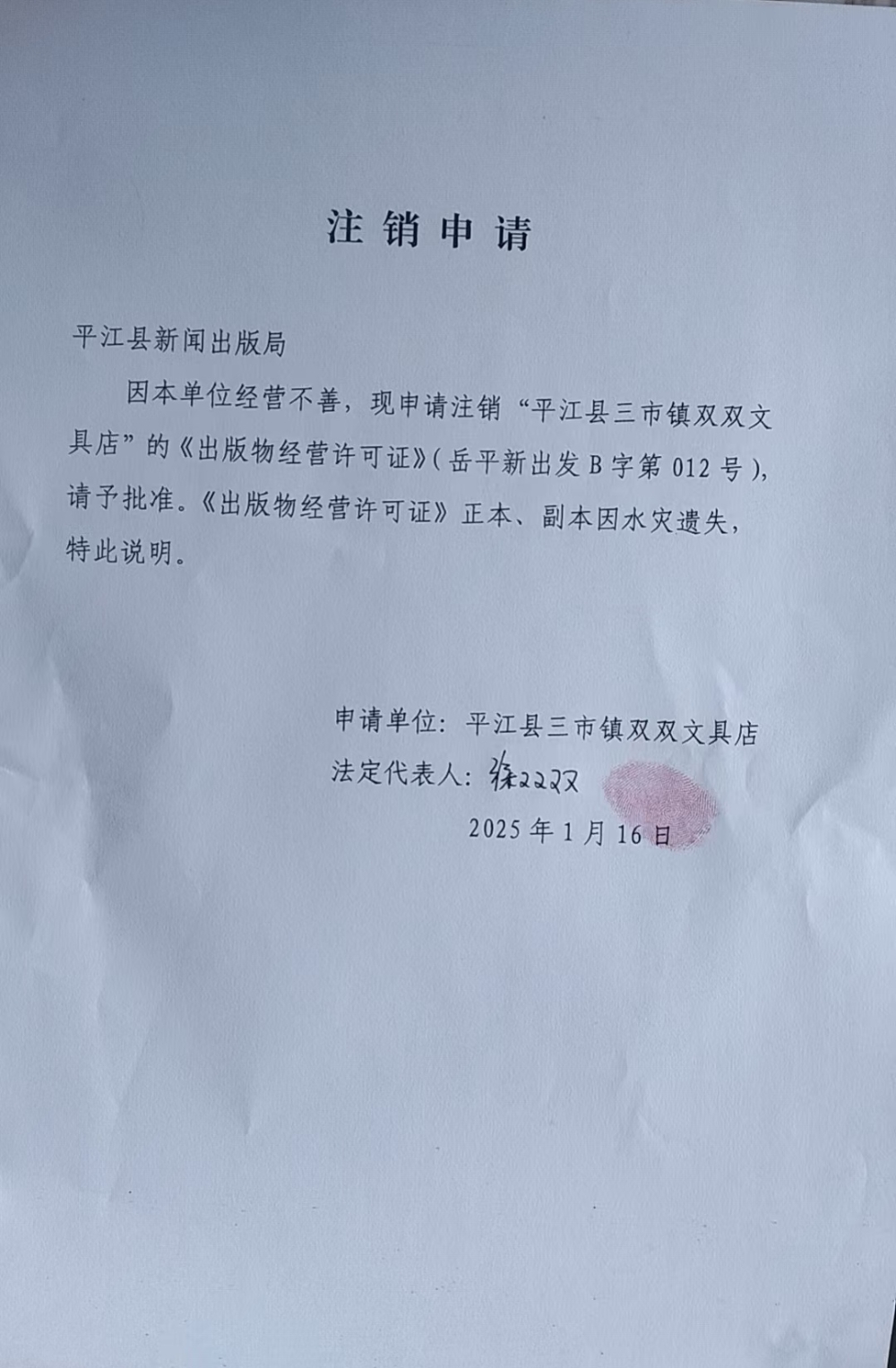 平江县三市镇双双文具店注销申请