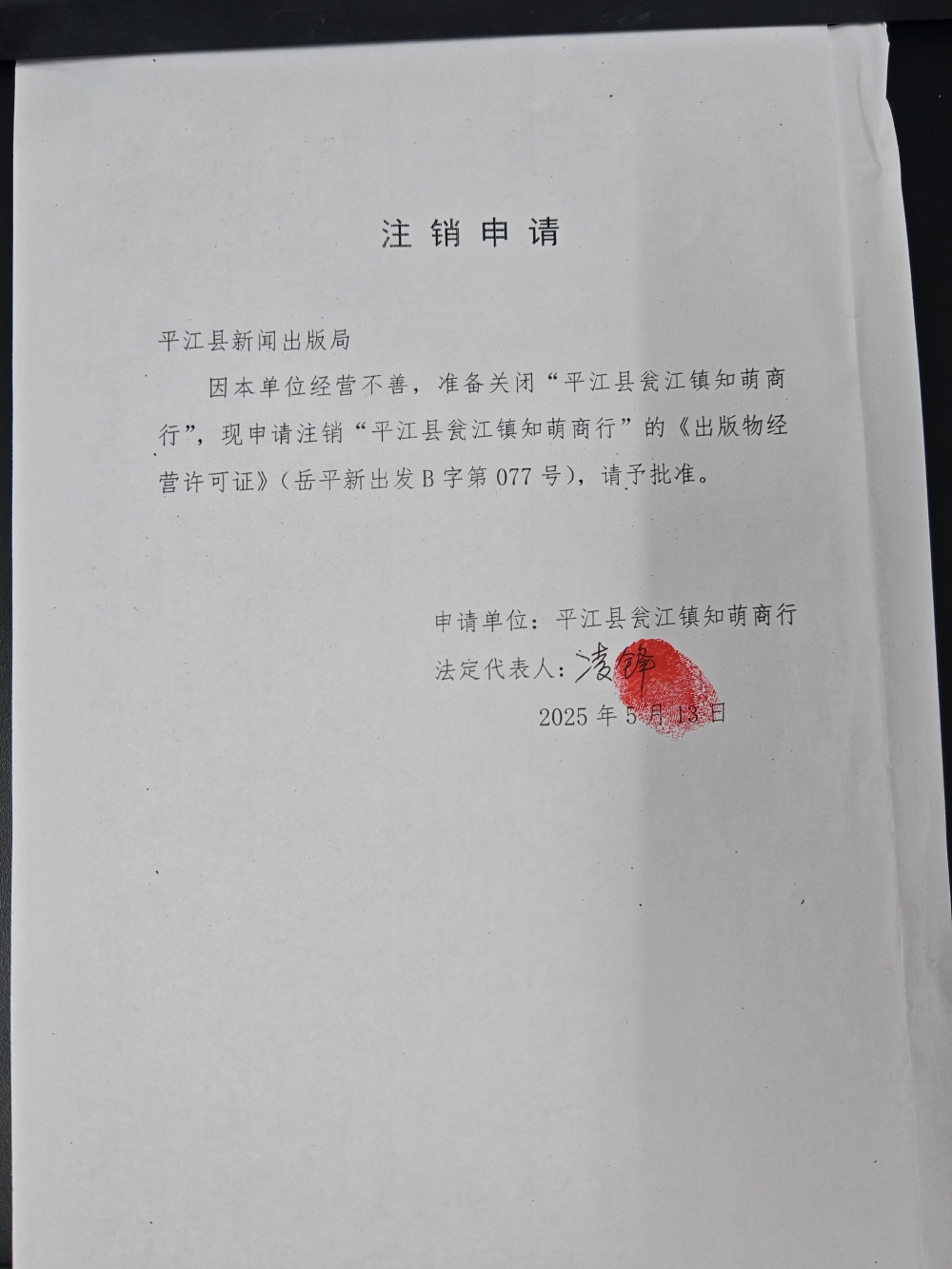 平江县瓮江镇知萌商行申请注销出版物经营许可证
