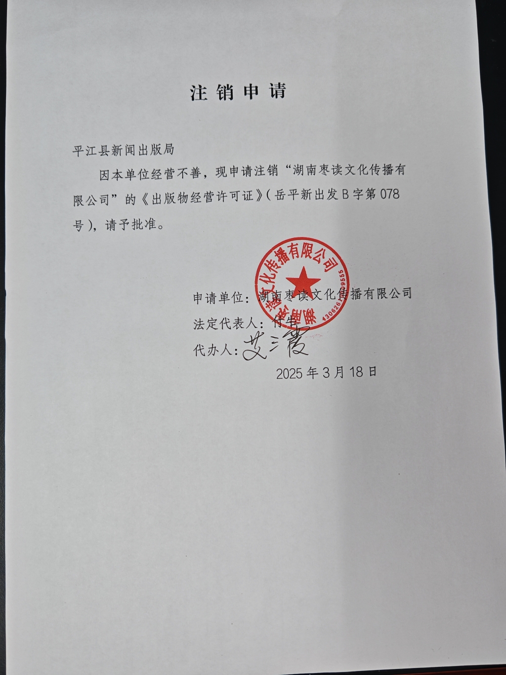 湖南枣读文化传播有限公司申请注销出版物经营许可证