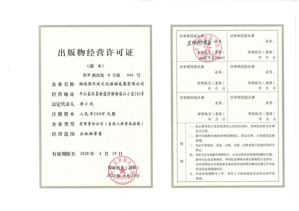 湖南须尽欢文化旅游发展有限公司出版物经营许可证