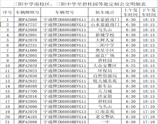 附1: 1、2号线:山水豪庭南门----三阳中学南校区 3号线:马头山社区--三阳中学南校区 4号线:新城学校---喜迎春---三阳中学南校区 5号线:大树人家---三阳中学南校区 6号线:三阳中学(育才路)一-三阳中学南校区 7号线:奥星小区--环卫所--海天景园--一中--柏翠湾--三阳中学南校区 8号线:丽富正门----丽富佳园----金盾小区----三阳中学南校区 9号线:碧桂园--天岳安置--长冲路口站--悦天城南苑--润民小区--三阳中学南校区 10号线:大众安置区--金财苑--颐华城--人民公园--凯旋世纪城--山水豪庭东门--三阳中学南校区 11号线:环保局--党校--楚才中学--三阳中学南校区 12号线:自然资源局--应急管理局站--供电公司--沿江路--平安巷--足球场-移动公司--百花台--广电文苑--明德学校--三阳中学南校区 13号线:悦天城北苑--中医院站--新妇幼--翘楚堂--三阳中学南校区 14号线:新车站--美景华城--政府小区--三阳中学南校区 15号线:天力城--公安局--金门第--纪念馆--江南花苑--三阳中学南校区特此申请! 16号线:三阳中学--洪家塅 17号线:三阳中学--碧桂园 18号线:马头山--三阳芙蓉学校 19号线:江南江化苑--环保局--党校--楚才中学--三阳中学--三阳芙蓉学校 20号线:老交警队--移动公司--百花台站--桂花学校--碧桂园北门--悦天城南--翘楚堂--凯旋世纪城--人民公园(马头山)--三阳芙蓉学校 21号线:一中--政府小区--美景华城--金门第--新妇幼--山水豪庭--星宇嘉园--三阳芙蓉学校
