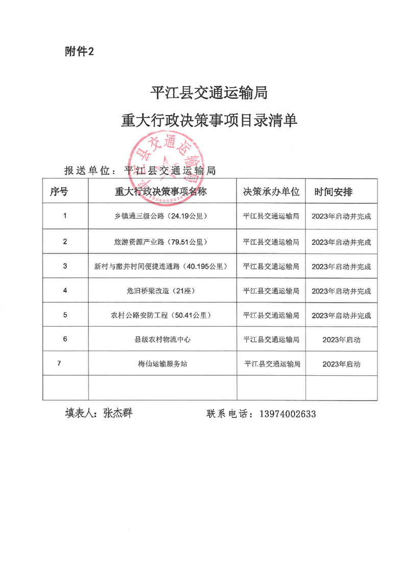 平江县交通运输局重大行政决策事项目录清单