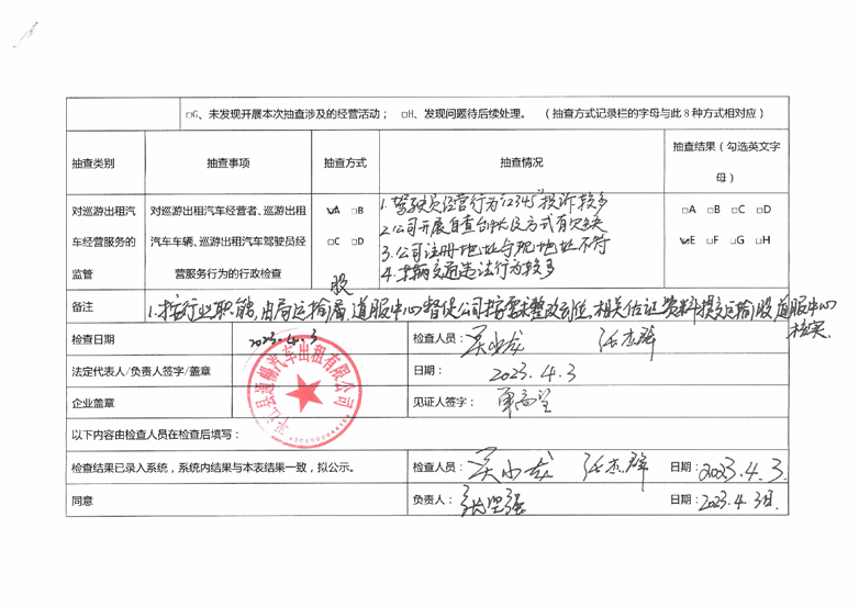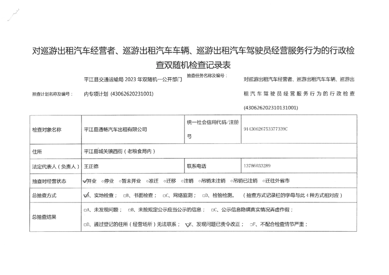 平江县交通运输局2023年“双随机、一公开”对巡游出租汽车经营者、车辆、驾驶员经营服务行为的行政检查表