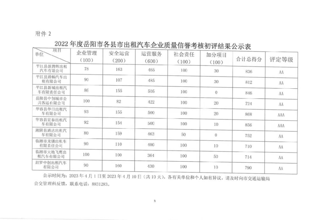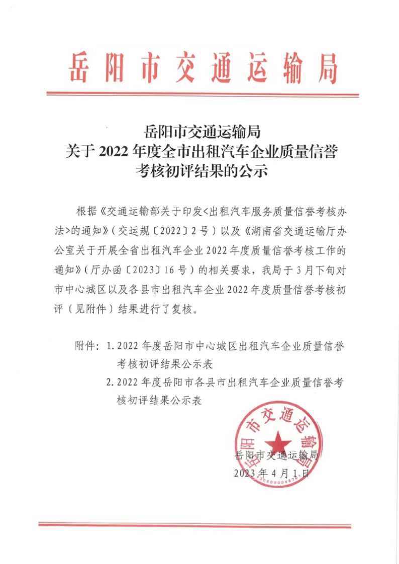 岳阳市交通运输局:关于2022年度全市出租汽车企业质量信誉考核初评结果的公示