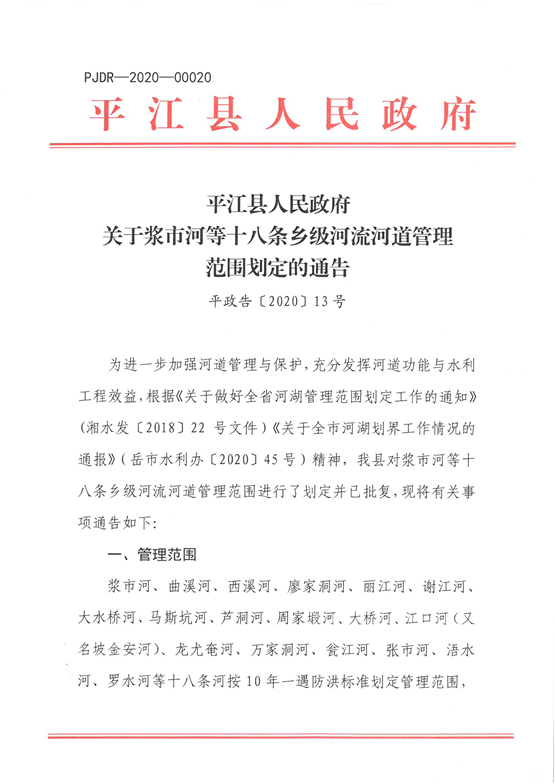 平江县人民政府关于浆市河等十八条乡级河流河道管理范围划定的通告