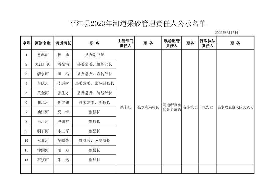 2023年平江县河道采砂管理责任人公示名单