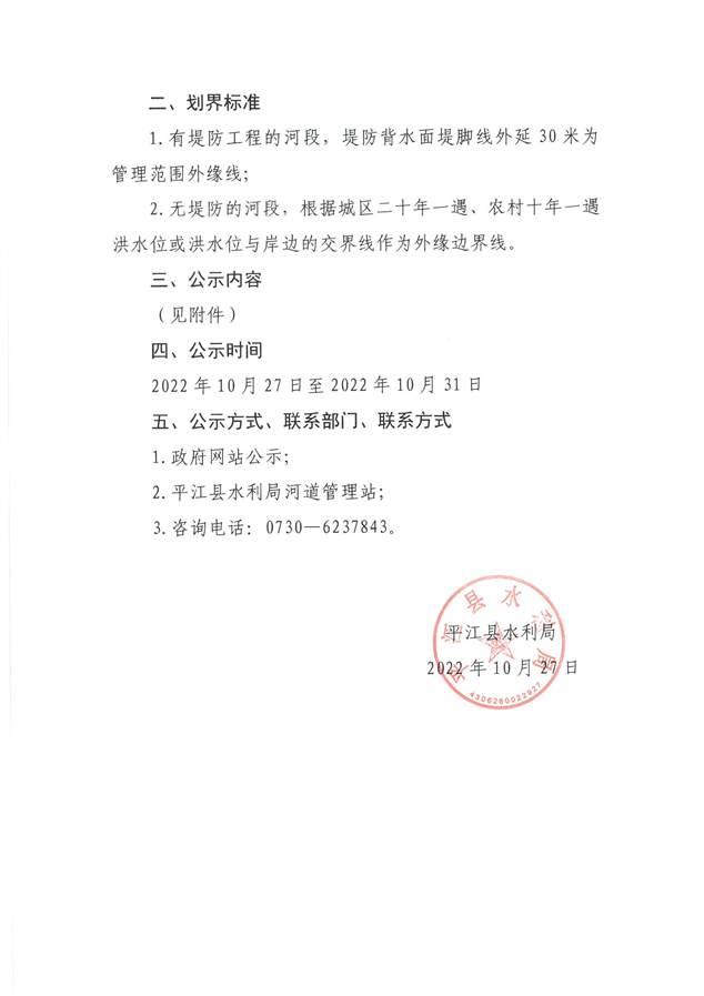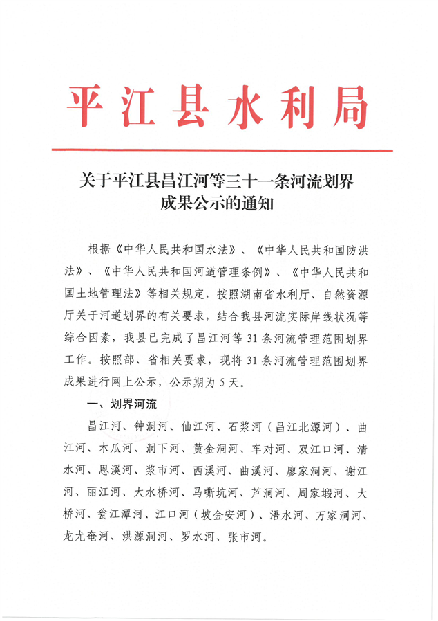 关于平江县昌江河等三十一条河流划界成果公示的通知