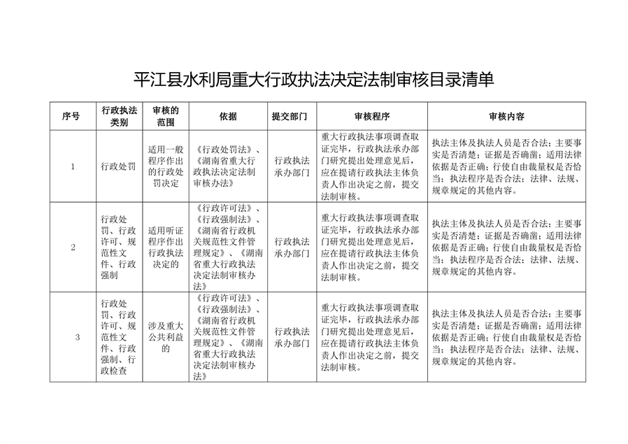 平江县水利局重大行政执法决定法制审核目录清单