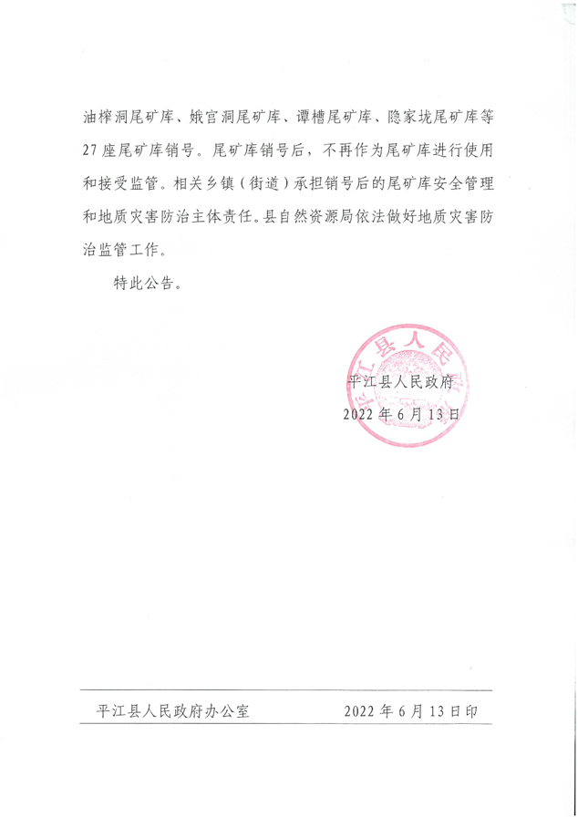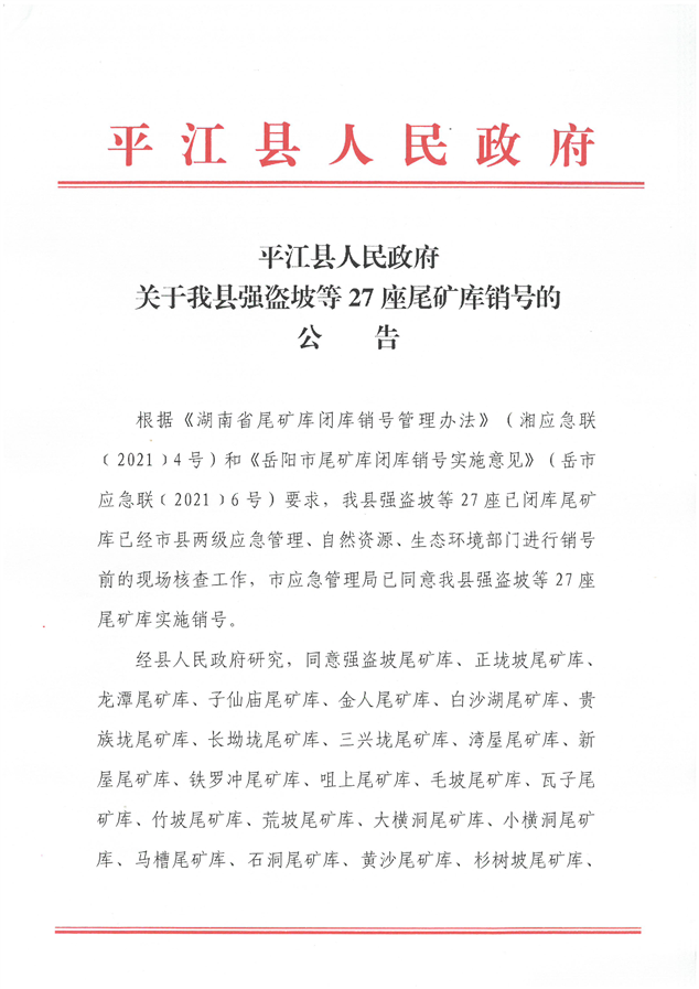 平江县人民政府关于我县强盗坡等27座尾矿库销号的公告