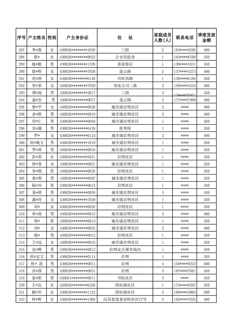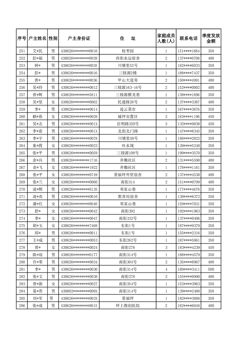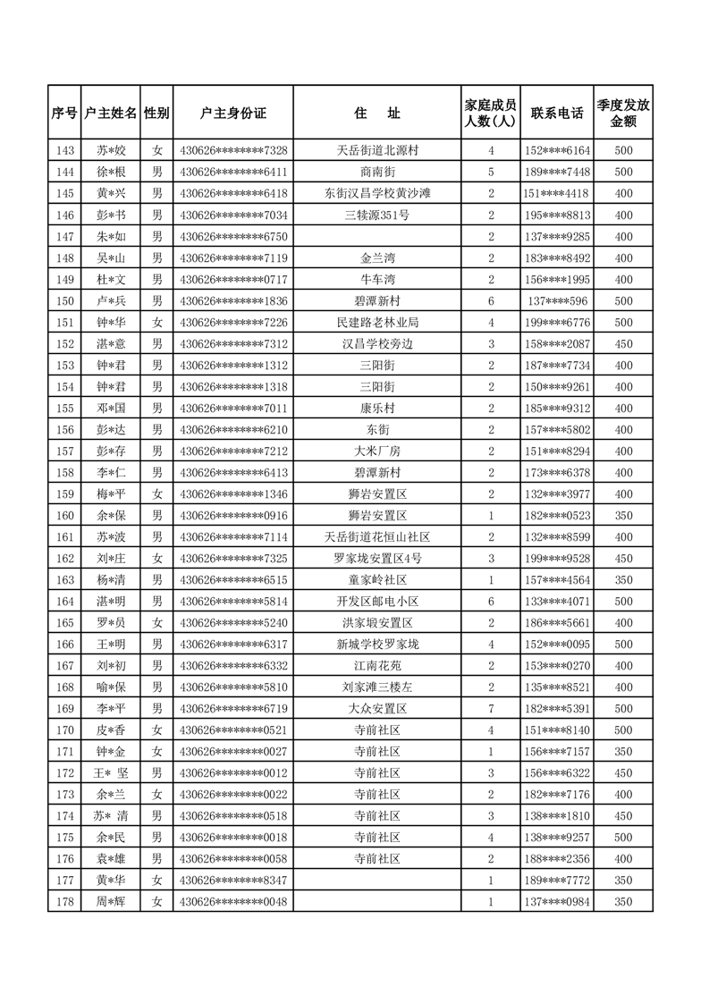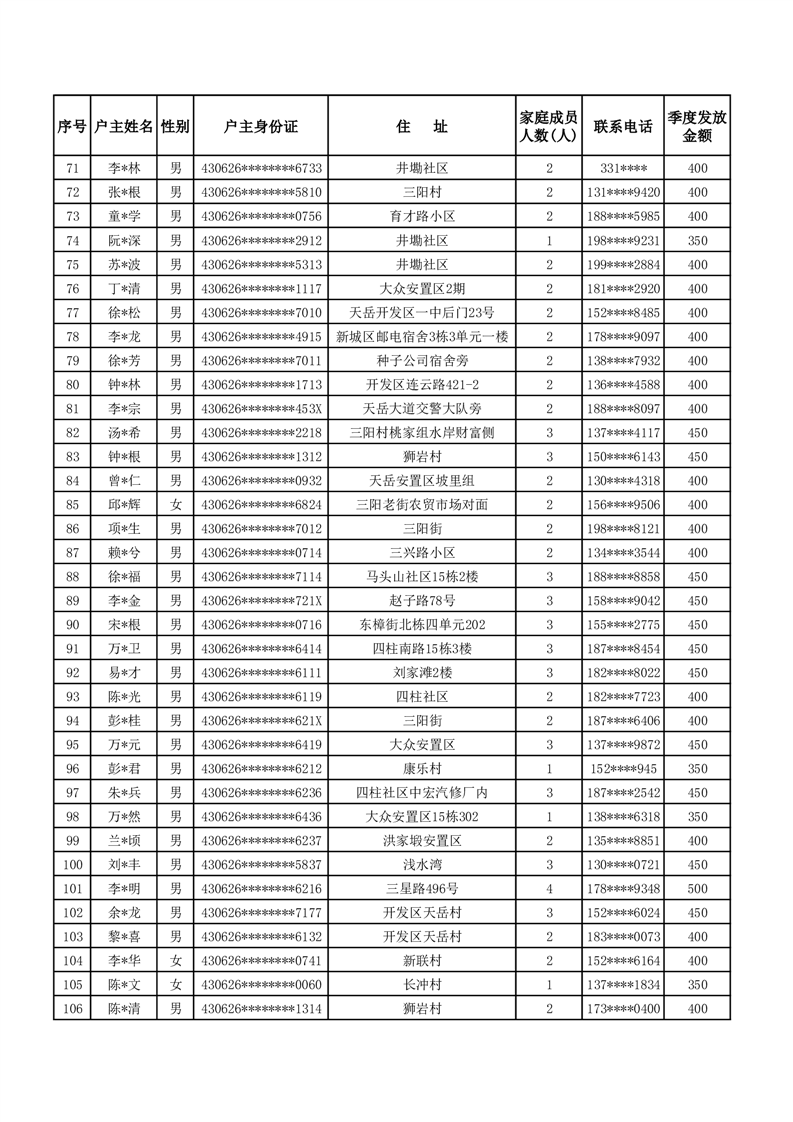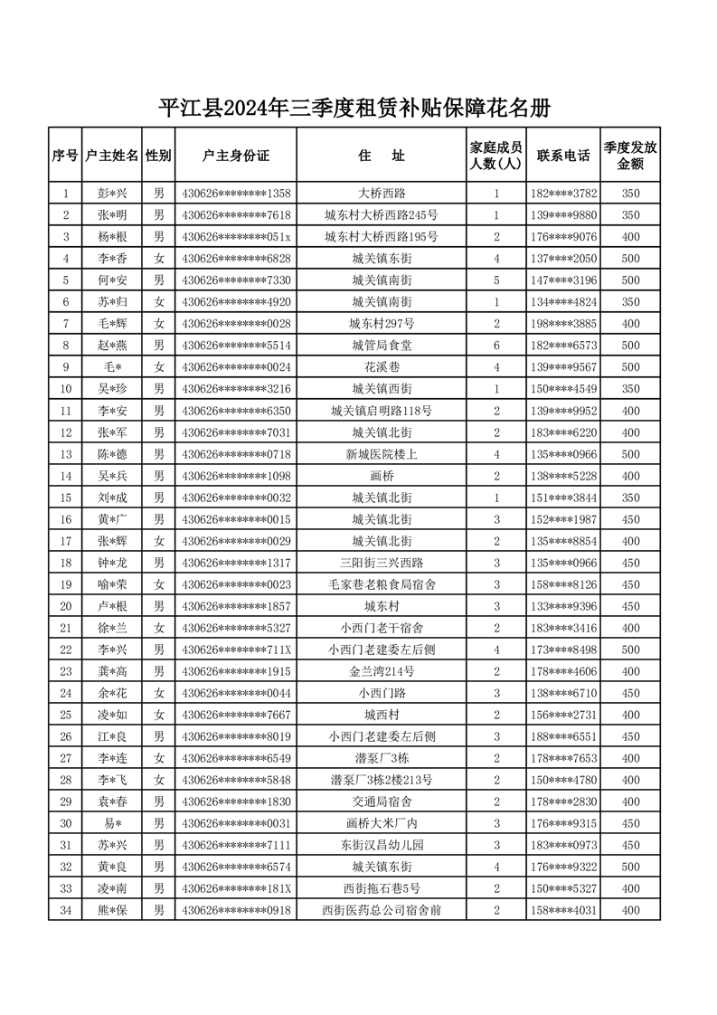 平江县2024年三季度租赁补贴保障花名册