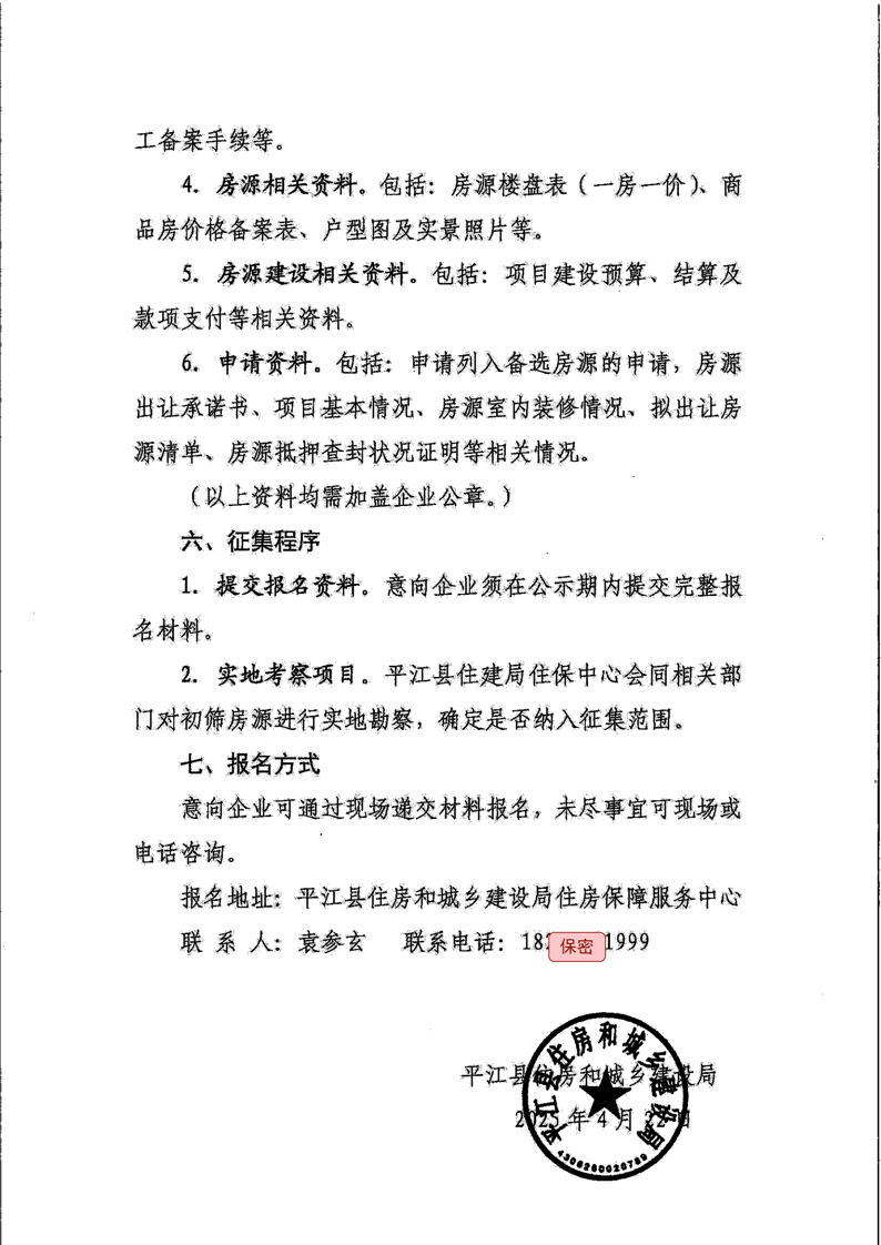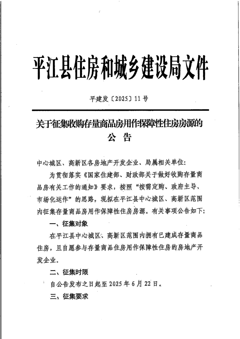 关于征集收购存量商品房用作保障性住房房源的公告(平建发〔2025〕11号)