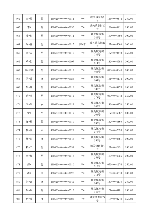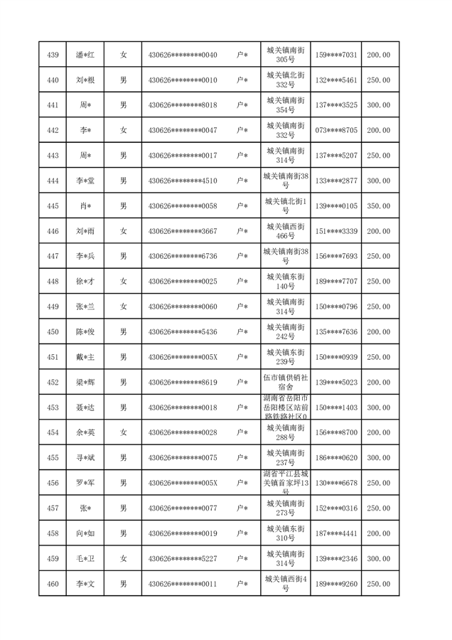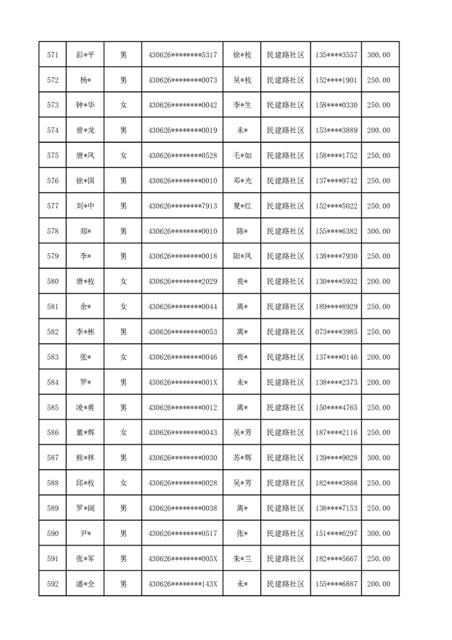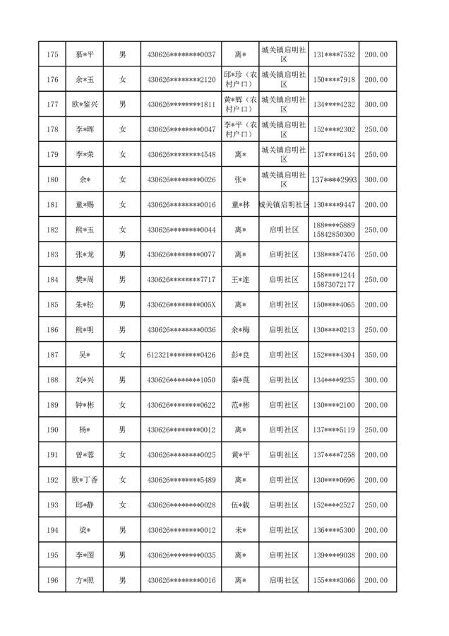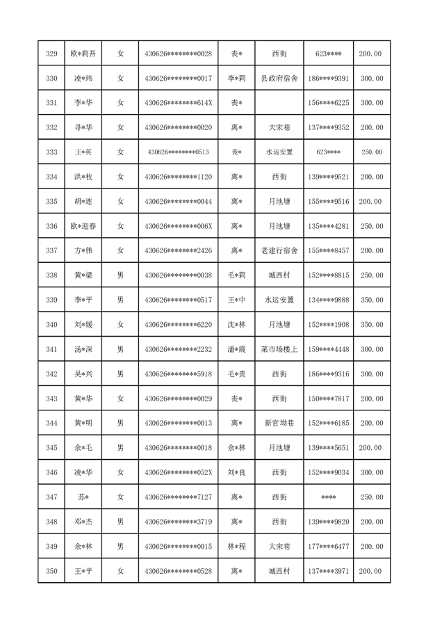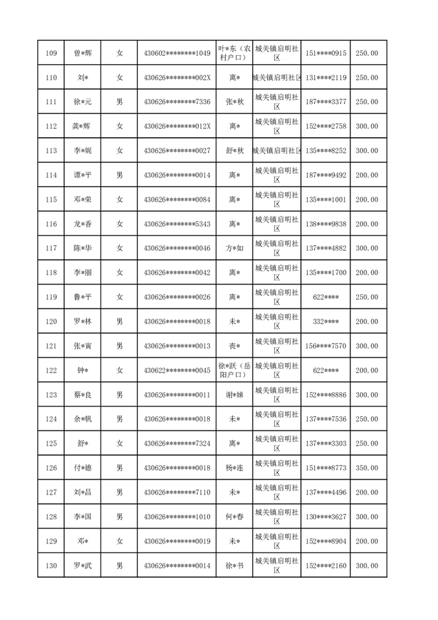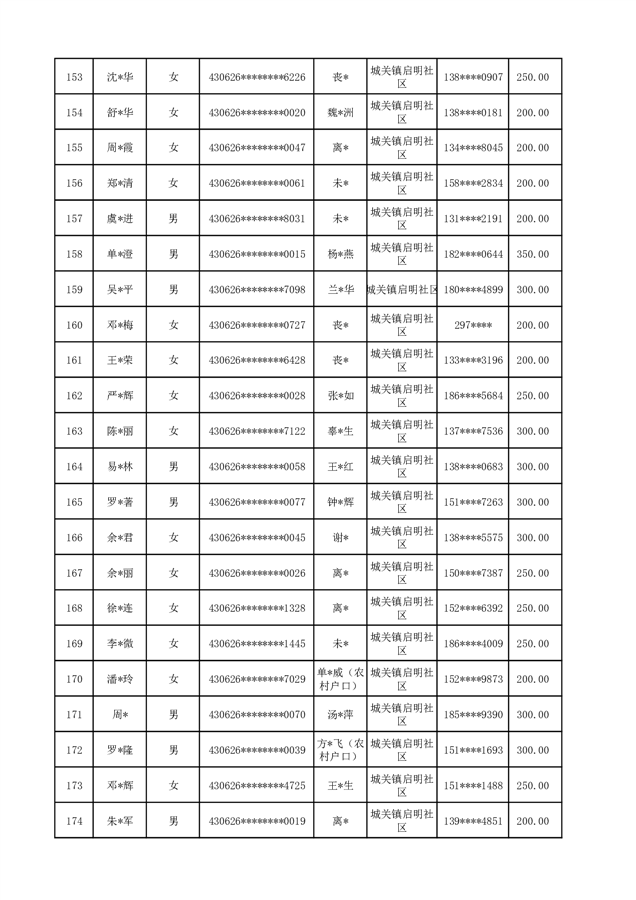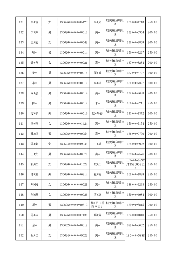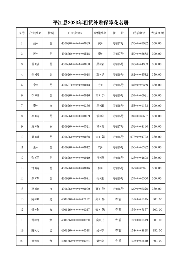 平江县2023年住房租赁补贴发放名册(第一季度) 明细表