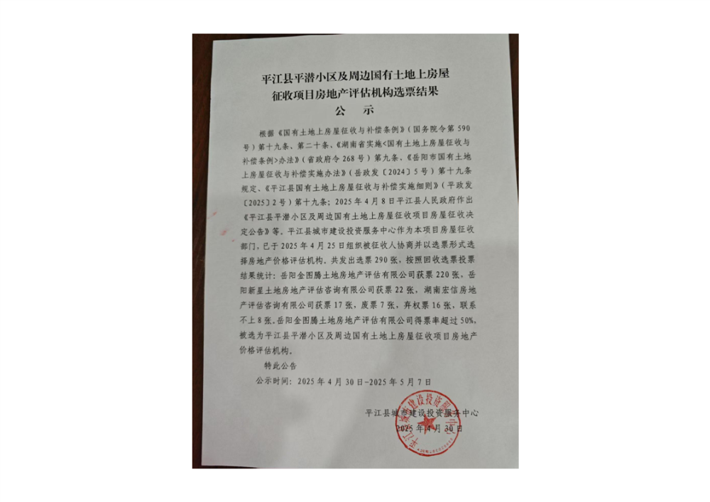 平江县平潜小区及周边国有土地上房屋征收项目房地产评估机构选票结果公示