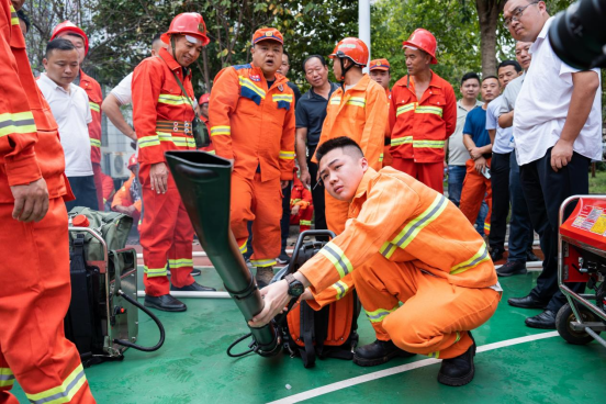 2.器械讲解 森林消防大队中队长向旺就高压水泵、灭火风机、便捷式水箱、灭火弹、油锯等常见扑火机具的使用方法和注意事项进行详细讲解和疑问解答,应急队员现场操作,虚心请教,直至全面掌握、熟练运用各项器具。
