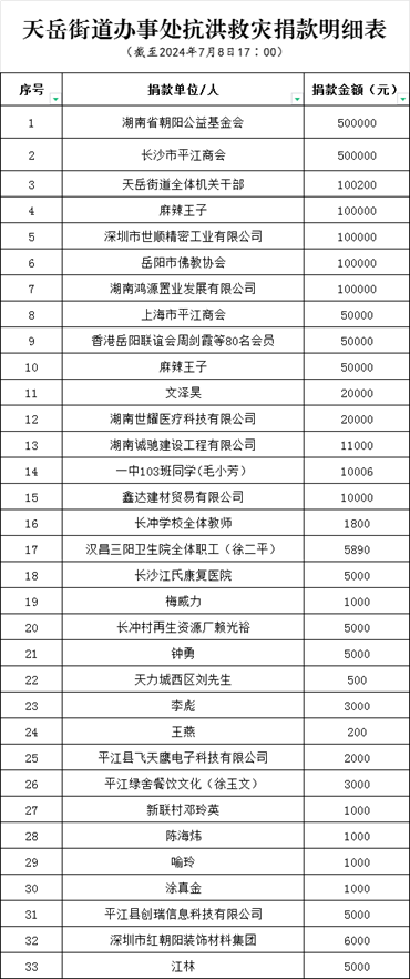 现将截止2024年7月8日17点,天岳街道接收捐赠情况公示如下: