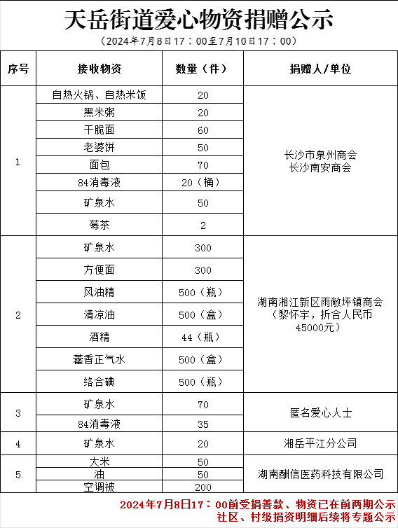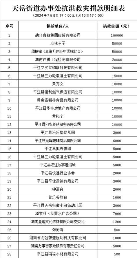 洪水无情、人间有爱!在这最吃劲、最关键的紧要关头,社会各界爱心企业、爱心人士发扬“一方有难、八方支援”的互助精神,伸出援手、奉献爱心、送上真情、点燃希望,踊跃捐款捐物,全力支持天岳街道防汛抗灾工作,积极帮助受灾群众重建家园、共渡难关。 现将截止2024年7月10日17点,天岳街道接收捐赠情况公示如下: 山川是坚固的桥梁 抵挡风雨的浸泡 爱心是真实的拥抱 将温暖铺满遥远的角落