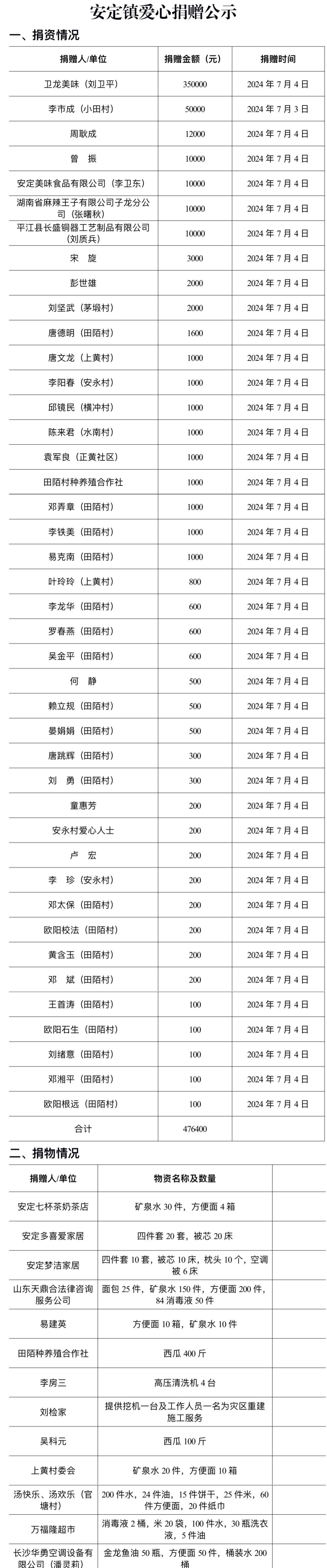 风雨同舟、守望相助--安定镇“7·1”特大洪灾爱心捐赠公示(第一期)