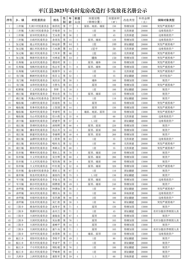 平江县2023年农村危房改造打卡发放花名册公示