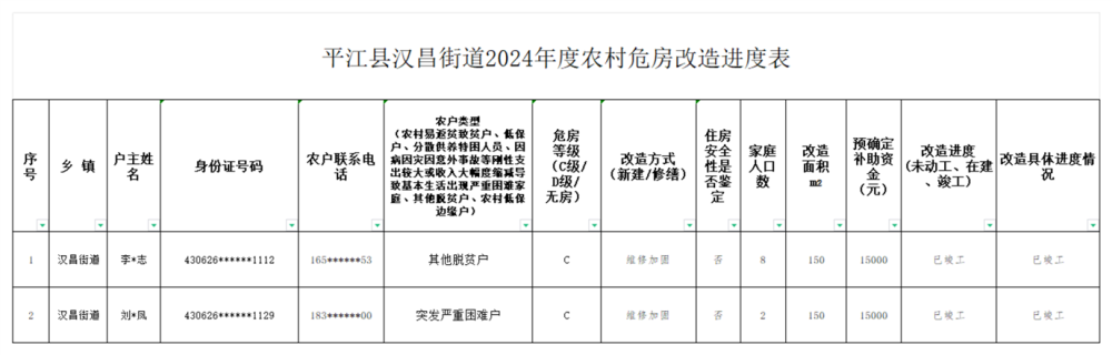 平江县汉昌街道2024年度农村危房改造进度表