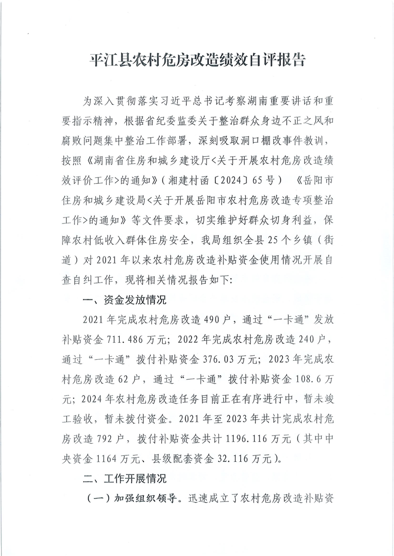 平江县农村危房改造绩效自评报告