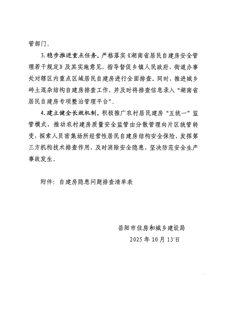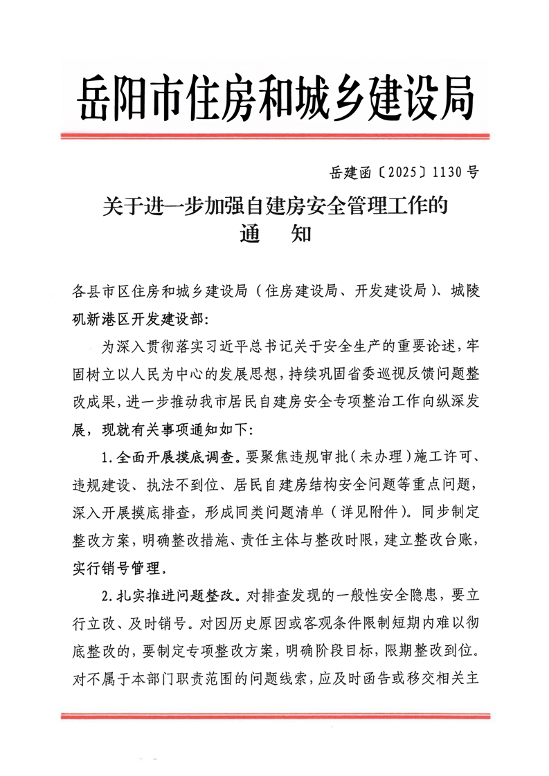 《关于进一步加强自建房安全管理工作的通知》(岳建函〔2025〕1130号)