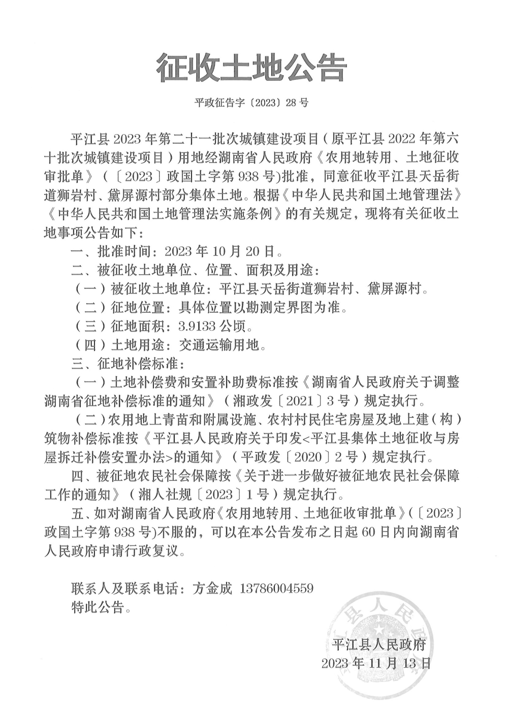 平江县2023年第二十一批次城镇建设项目征收土地公告