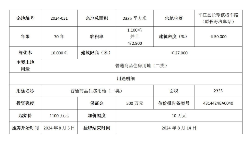平江县长寿镇将军路侧(原长寿汽车站)国有建设用地使用权公开出让