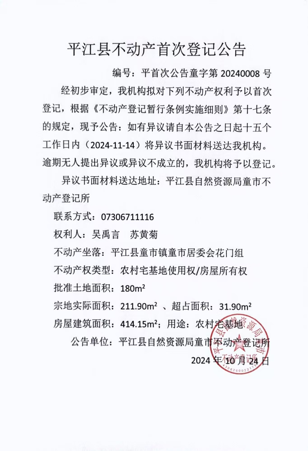 平江县不动产首次登记公告(吴禹言)