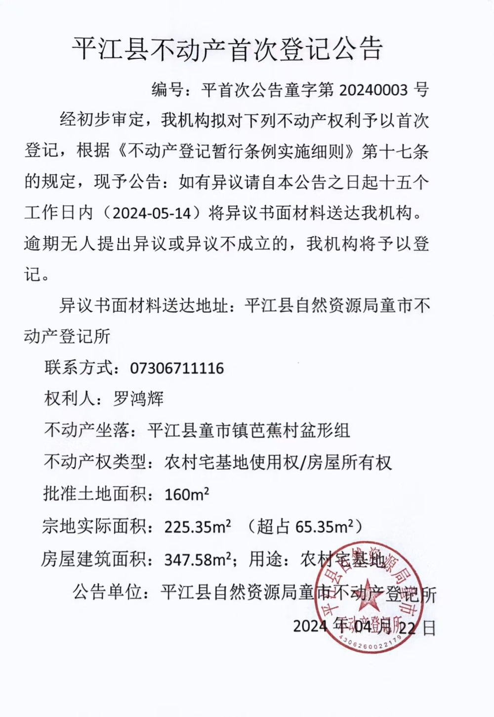 平江县不动产首次登记公告(童市镇罗鸿辉)