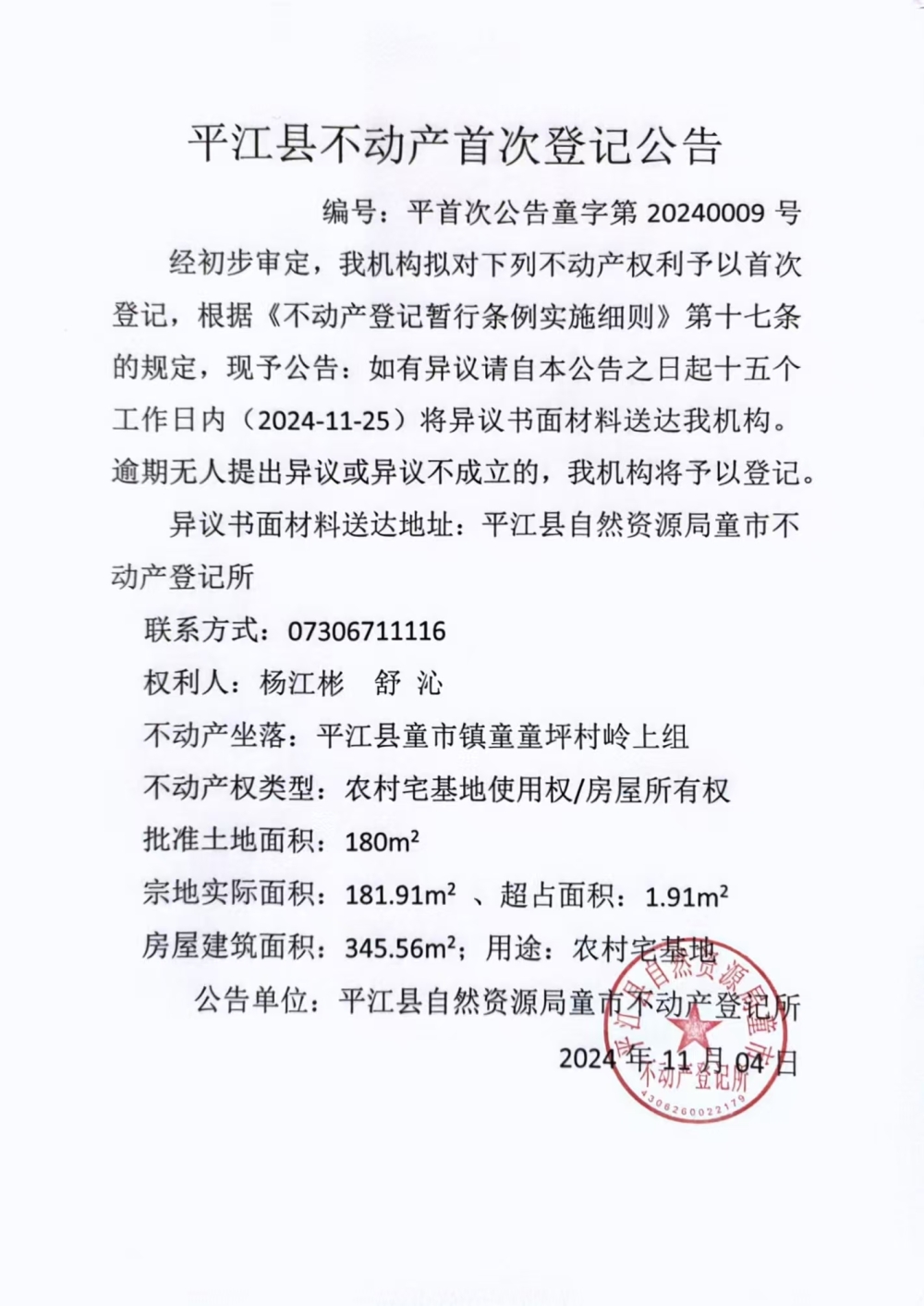 平江县不动产首次登记公告(杨江彬)
