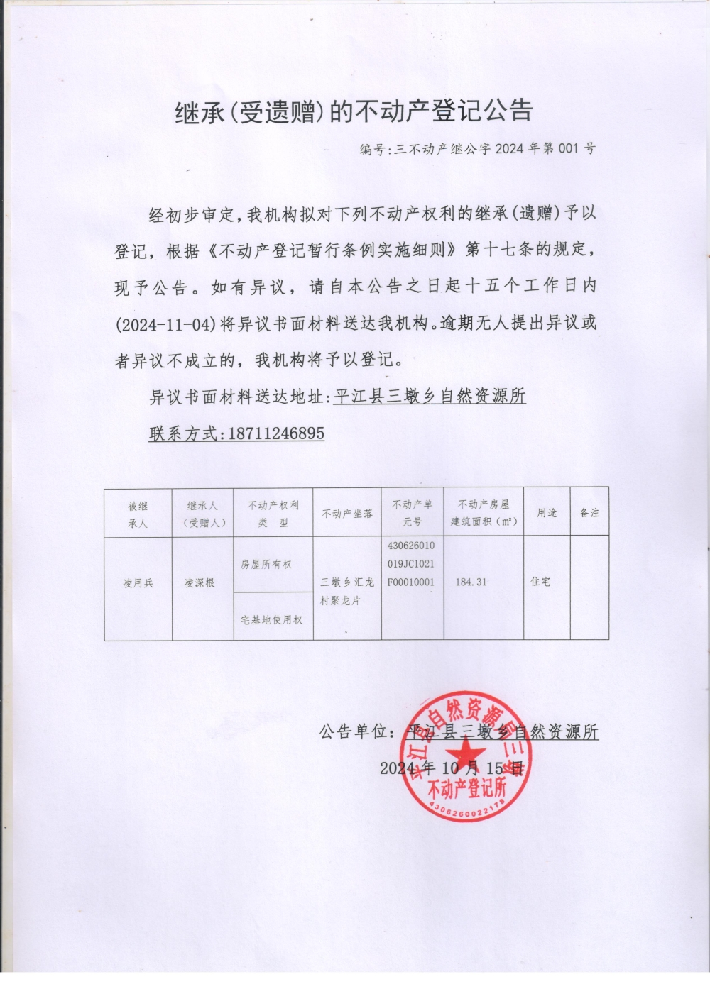 平江县三墩乡继承(受遗赠)的不动产登记公告