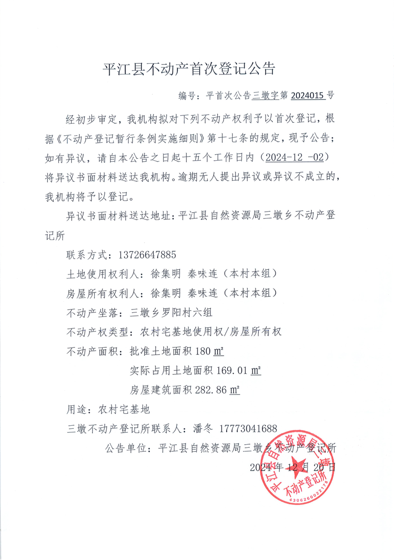 平江县三墩乡平江县不动产首次登记公告 徐集明 秦味连