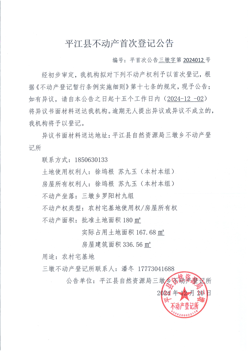 平江县三墩乡平江县不动产首次登记公告 徐坞根 苏九玉