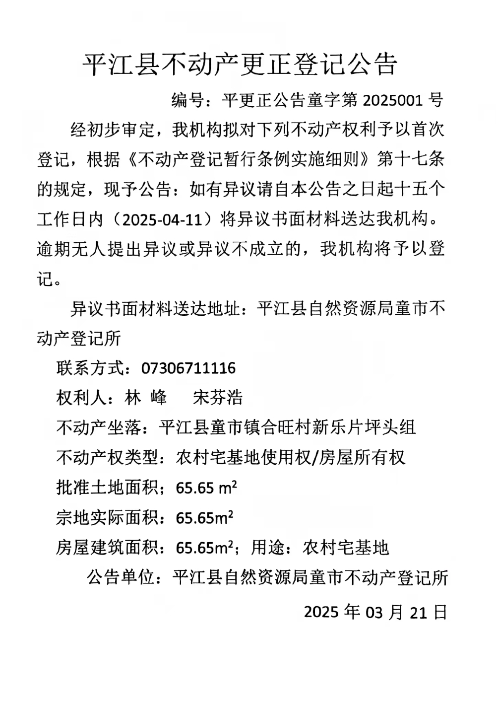 平江县不动产更正登记公告(林峰 宋芬浩 )