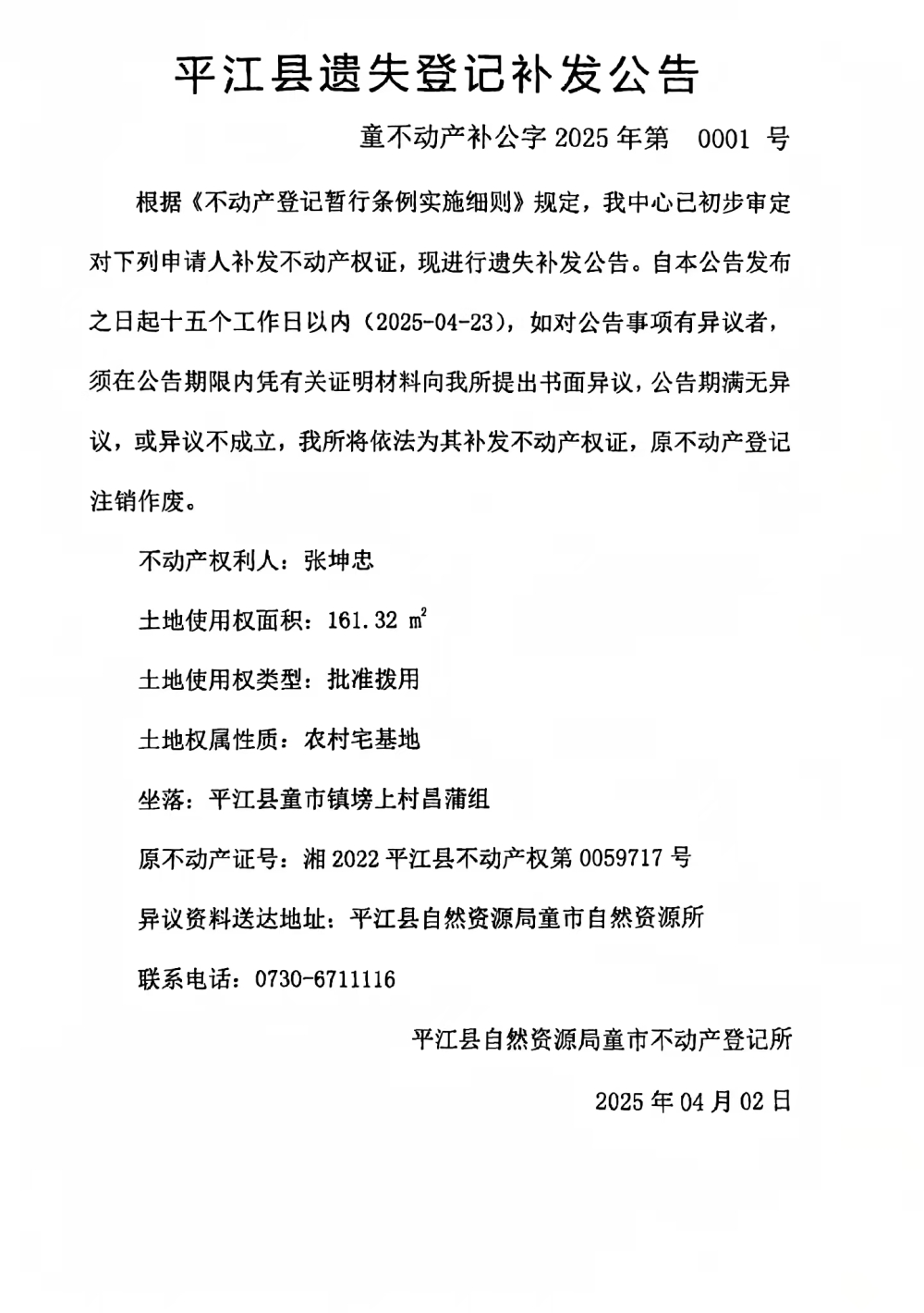 平江县遗失登记补发公告(张坤忠)