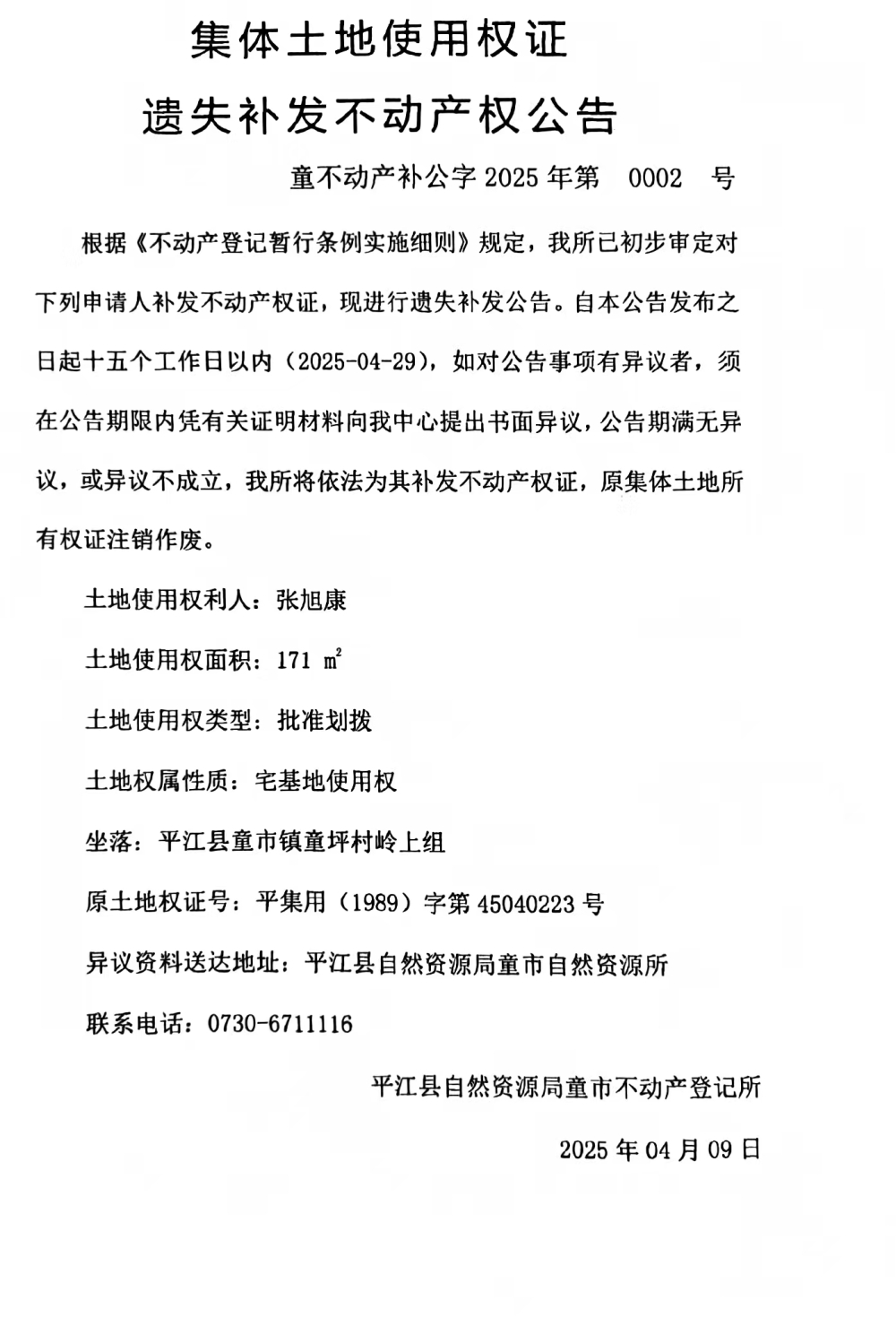集体土地使用权证遗失补发不动产权公告(张旭康)
