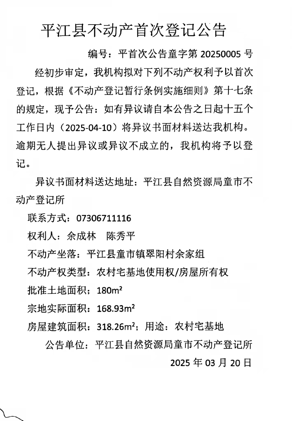 平江县不动产首次登记公告(余成林 陈秀平)