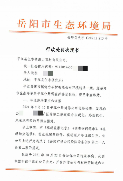 平江县伍市镇海力石材有限公司215号行政处罚决定书