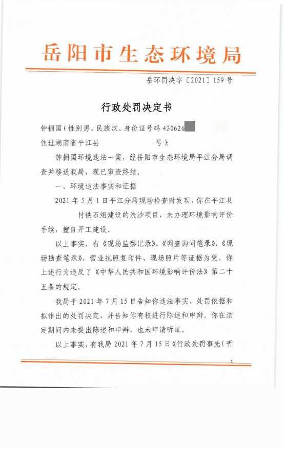 钟拥国159号行政处罚决定书