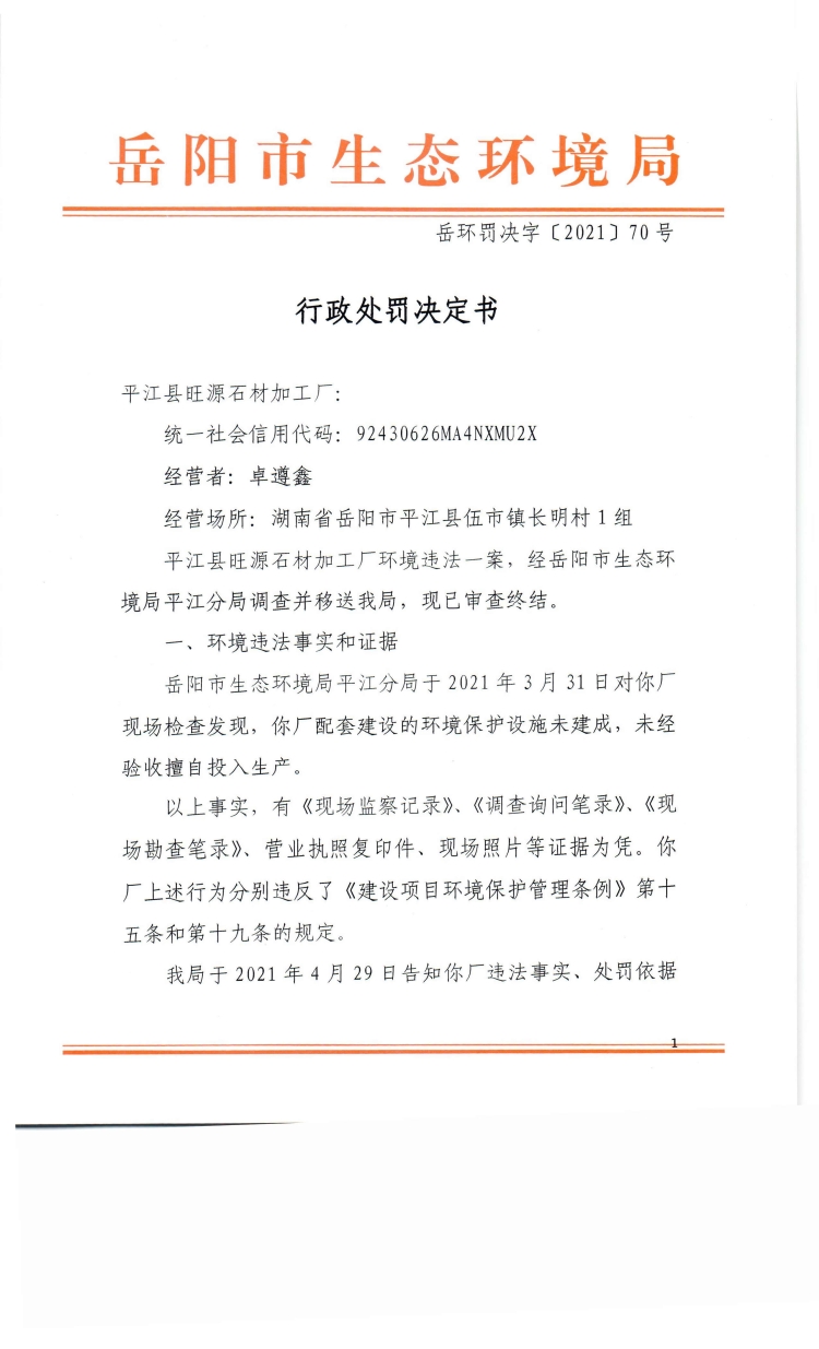 平江县旺源石材加工厂—岳环罚决字[2021]70号