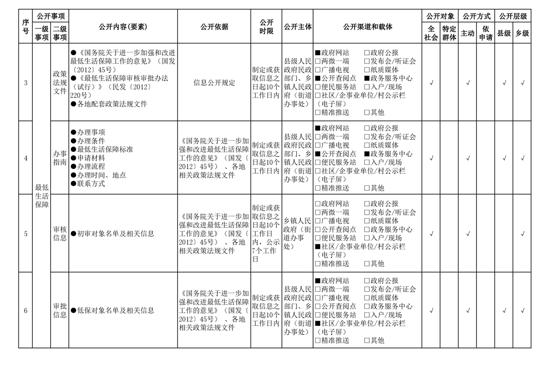 | 公开依据 | 《国务院关于进一步加强和改进最低生活保障工作的意见》、各地相关政策法规文件 | ||