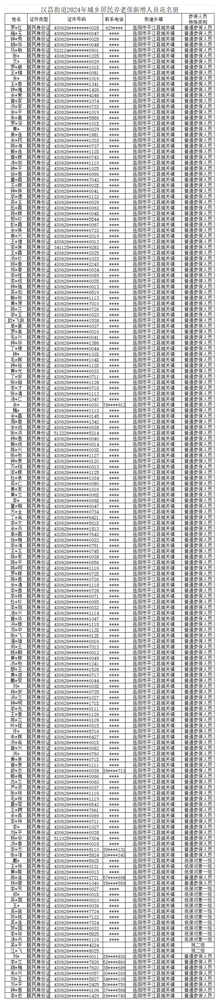 汉昌街道2024年城乡居民养老保新增人员花名册