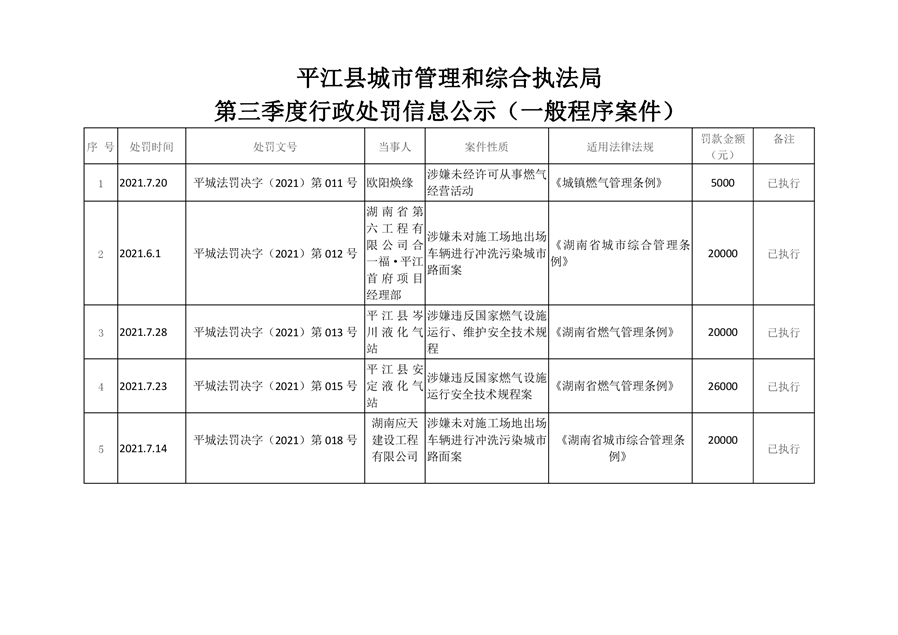2021年平江县城市管理行政执法局第三季度行政处罚信息公示 (一般程序案件)