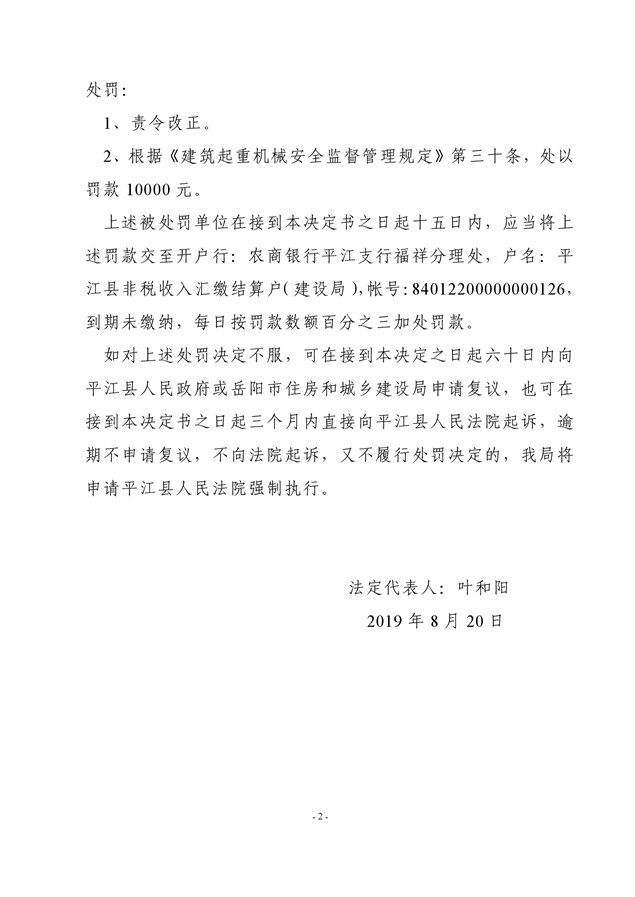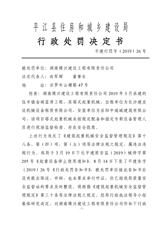 行政处罚决定书平建行罚字(2019)26号