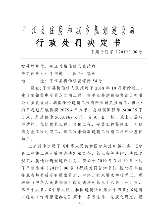 行政处罚决定书平建行罚字(2019)6号