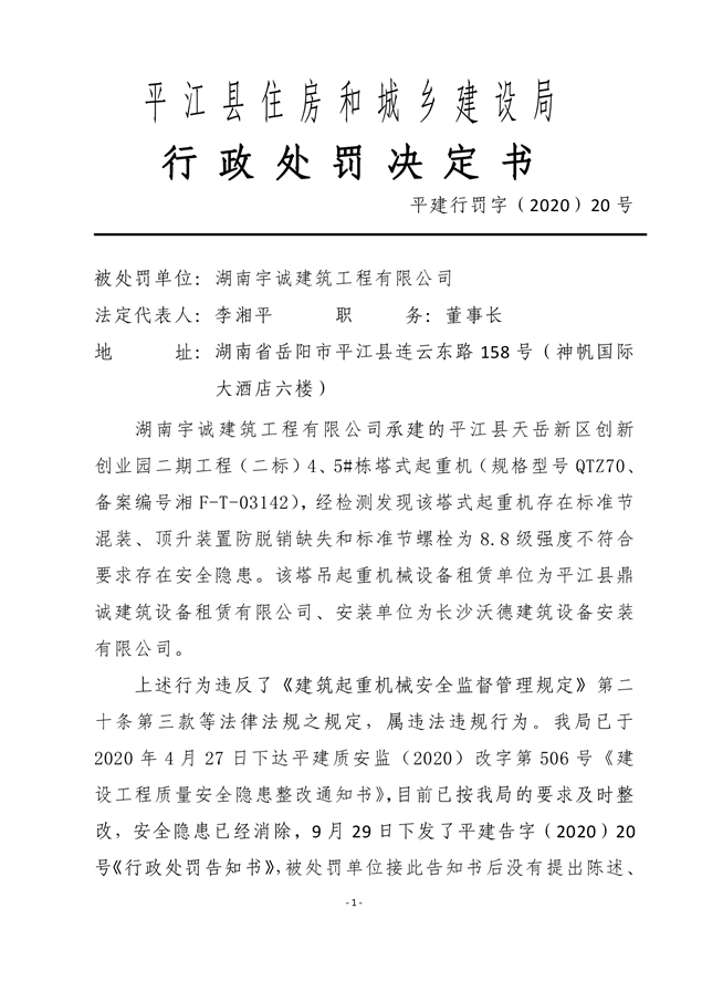 行政处罚决定书平建行罚字(2020)20号