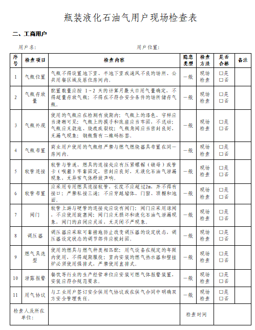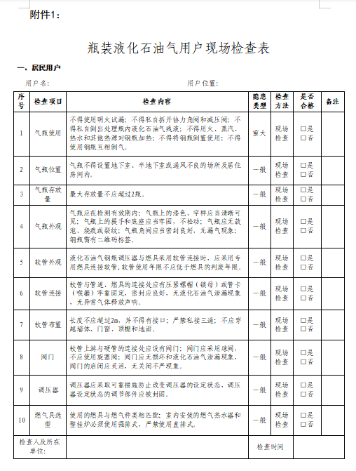 四、主要内容 (一)上门做宣教。各村要采取分包到户、责任到人、网格化包片方式,逐一敲门入户,向燃气用户发放宣传资料,并通过悬挂安全标语、播放“村村响”广播等方式生动宣传燃气安全法律法规、安全常识,教会用户正确用气,预防一氧化碳中毒,进一步提升用户自救互救能力。 (二)上门除隐患。对燃气用户使用直排式热水器、燃气设施、燃气灶具、燃气橡胶软管等检查内容(附件1、2)进行排查,建立隐患台账。发现存在安全隐患的,要求用户及时整改,拒不配合的,及时报告镇安全办,确保问题整改到位,消除安全隐患。 (三)上门听民声。耐心倾听燃气用户对燃气监管、服务、价格等方面的意见建议,认真做好记录,掌握用户安全用气有关情况,并现场解答或及时解决,真正让广大用户从心底满意。 五、时间安排 (一)动员部署阶段(2023年6月5日前)。各村结合实际通过召开专题会议进行部署研究,明确网格划分,明确责任到人。 (二)宣传发动阶段(2023年6月5日-6月15日)。各村要广泛宣传,营造“敲门行动”浓厚氛围,利用户外电子屏、宣传栏、宣传横幅、发放宣传手册等多种形式宣传普及燃气安全使用知识,提高居民安全防范意识。 (三)集中实施阶段(2023年6月15日-10月31日)。各村要针对辖区内燃气用户逐户开展“敲门行动”,做到不漏一企、不落一户、不留空白、不留盲点,尤其是对排查出来的安全隐患要逐一建立台账,所有问题要明确整改责任人、整改措施,按要求整改到位。其中6月-7月集中开展排查,6月25日前排查辖区内总户数(含农户及工商业户)的30%,7月10日前排查辖区内总户数的70%,7月25日前排查辖区内总户数的100%,8月-10月进行问题集中整改。 (四)督导检查阶段(2023年6月15日-12月31日)。镇安全办将联合镇督查室成立督导组,对各村“敲门行动”开展情况不定期进行督导检查。督导检查结果进行通报并纳入村级绩效考核,并将主体责任不落实的工商业户纳入重点监管对象名单。 (五)巩固提升阶段(2024年1月1日起)。2024年起,常态化开展“敲门行动”,切实巩固拓展工作成果,确保城镇燃气安全形势持续稳定向好。 六、保障措施 (一)加强组织领导。各村要高度重视,切实履行属地管理责任,精心组织村干部、工商业户落实落细“敲门行动”,确保“敲门行动”取得实效。 (二)强化调度通报。镇安全办建立定期调度通报机制,按时间节点调度通报工作开展情况,对工作推进缓慢的要通报批评。 (三)严肃追责问责。“敲门行动”期间发生燃气安全事故的,将依法依规彻查事故原因,倒查属地管理责任、部门监管责任、企业主体责任,对涉嫌失职渎职的,移交司法机关依法处理。 各村要明确一名燃气安全联络信息员,于每月24日(以及7月9日)前向镇安全办报送“敲门行动”的进展情况。联系人:朱晨,联系电话:15073085122。 附件: 1.瓶装液化石油气用户安全检表(居民和工商用户) 2.城镇燃气安全整治“敲门行动”专项工作进展情况表 ![]() ![]() ![]() |